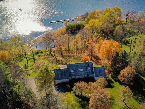 Wings Point offers privacy and a strong sense of place within a quiet, sought-after lakeside community. Set on 2.5± acres with nearly 200 feet of waterfront, this 2,466± SF home by architect Howard Fitzpatrick blends contemporary design with natural materials. The open floor plan highlights natural light and lake views, featuring a slate-floored foyer, cedar shingle roof, and painted clapboard exterior. French doors open from the dining area to a stone patio and screened porch, ideal for enjoying Vermont’s seasons. The first-floor primary suite provides privacy, while two upstairs bedrooms share a bath and balcony overlooking landscaped grounds and sunsets. Association amenities include 19 acres of common land, two clay tennis courts, a beach, dock, and two moorings for the property. Located just 30 minutes from Burlington with easy access to the New York ferry.