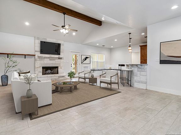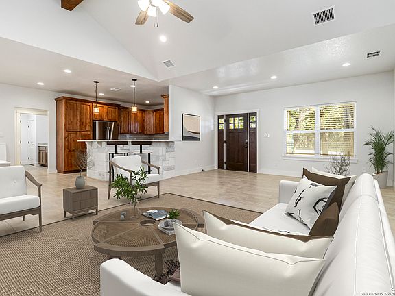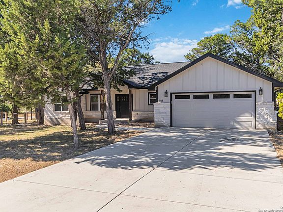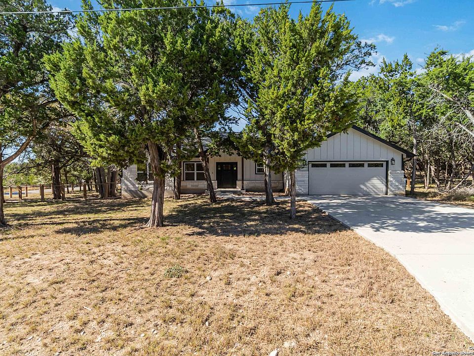 Discover modern Hill Country living in this stunning 3-bedroom, 2-bath home built in 2021 and situated on an expansive over half-acre corner lot in the sought-after Bandera River Ranch community. Thoughtfully designed for both comfort and style, this home welcomes you with an open-concept layout, abundant natural light, and high ceilings that enhance the spaciousness of the main living area. A beautiful rock fireplace serves as the focal point, creating a warm and inviting atmosphere. The well-appointed kitchen features 42" upper cabinets, granite countertops, a classic subway tile backsplash, reverse osmosis system, and a convenient breakfast bar-perfect for casual dining or entertaining. A versatile flex room offers endless possibilities and can easily serve as a home office, gym, or playroom to suit your lifestyle. Retreat to the private primary suite, complete with a luxurious en-suite bathroom showcasing a large walk-in shower, dual granite vanities, and a spacious walk-in closet with custom built-ins. Two additional guest bedrooms provide comfort and convenience for family or visitors. Step outside to enjoy Texas living at its finest on the large covered back patio, overlooking a generous yard with ample space to add a pool, garden, or outdoor kitchen. The finished 2-car garage includes a floor A/C unit, , new water softener, and offering flexibility for use as a workshop, home gym, or hobby space. Even better-all appliances convey, including the refrigerator, stove, microwave, dishwasher, washer, dryer, and deep freezer, making this home truly move-in ready. Located in a peaceful and desirable neighborhood with access to community amenities, which includes a 24 acre park, tennis, basketball, BBQ, and pool. This property combines modern comfort with serene Hill Country charm. Schedule your showing today-this exceptional home won't last!