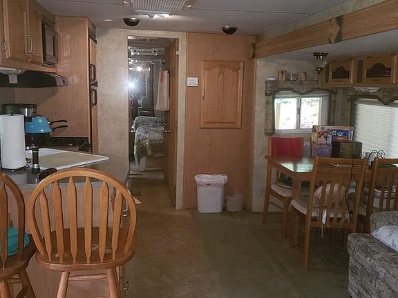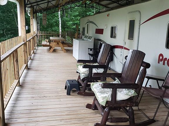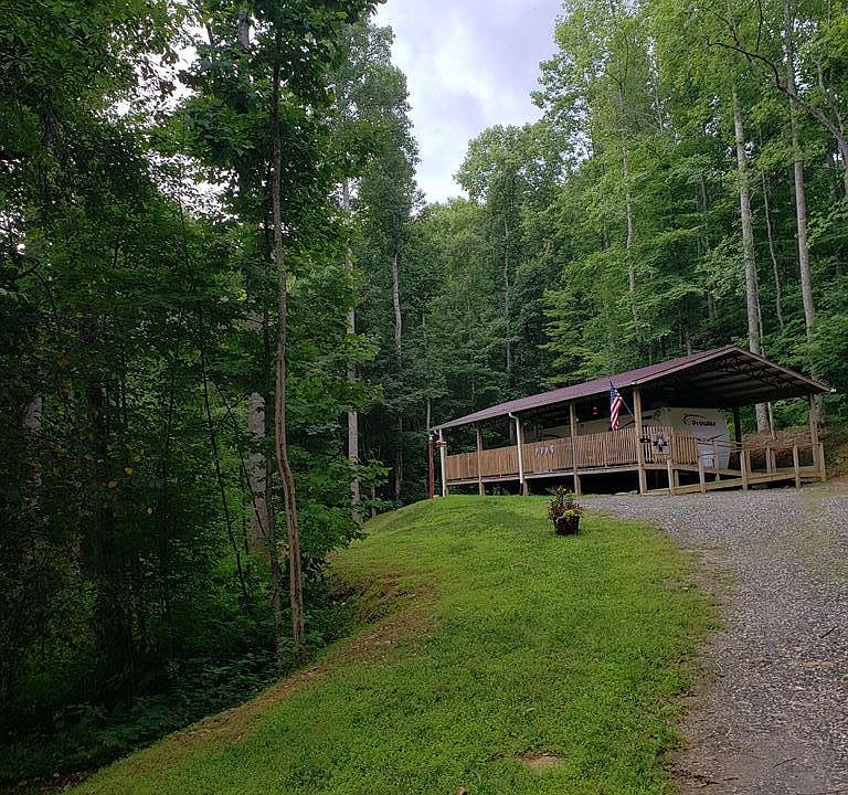 RV with covered pavilion and Huge full length deck. RV has 2 bedrooms and is a 2007 Fleetwood 36 ft with two slides. Lot is .91 ac with well and septic installed. Cool wooded setting in the desirable South Toe Valley.