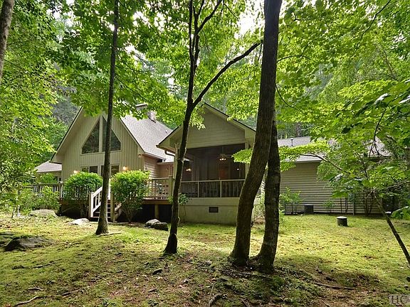 Tucked away in the scenic enclave of Holly Berry Estates between two trout-filled streams, this custom three bedroom, three and a half bath home is a true mountain retreat. The 6.75 acre lot begins at the gated driveway and surrounds the home in lush foliage and mature trees. Listen to the rushing waters of Greens Creek from the screened porch and open decks or take a leisurely walk through the quiet neighborhood. Relaxation and tranquility are the inspiration for this beautiful property, a perfect escape from the stress of city life. The one-story open floor plan is ideal for families and entertaining guests of all ages. The great room features high-pitched wood and beamed ceilings and a massive rock fireplace, adding to the inviting mountain feel. Updates include stainless steel appliances, fresh paint, new carpeting, refinished hardwood floors, and plenty of interior and exterior entertainment areas. Ownership in Holly Berry Estates includes deeded access to two private lakes with fishing, swimming, canoeing, and a picnic area against a stunning backdrop of Whiteside Mountain's incredible rock face. Located minutes from Cashiers and Highlands, Holly Berry Estates is a thriving, friendly community, ideal for weekend getaways or year round living.