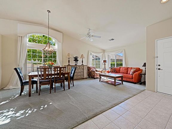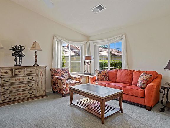 Prime Central Palm Desert Location. This 2 bed/2 bath 1700 sq. ft. home, with den, can be converted to a 3 bedroom. Located in the gated community of Merano, this home is nestled in privacy. Inside you will find an open floor plan with a fireplace between the living/dining area and family room open to the kitchen. Upgrades include newer windows and sliders, Quartz countertops in kitchen, newer A/C and pool equipment. Indoor laundry and 2 car garage. HVAC systems maintained annually. Enjoy the pool and spa with no rear neighbors and a well appointed desert landscaped yard. There are mature fruit trees on the property. Bristol Farms, Albertons, coffee shops and many restaurants located just outside the gates of this coveted community. Eisenhower Medical Center is 5 minutes away.