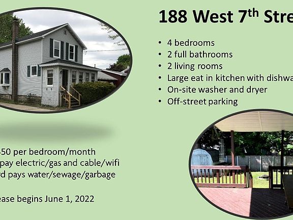 This is a great house for students! There are 2 spacious living areas and 4 large bedrooms, 2 full bathrooms and off-street parking. Plus - local landlords who are attentive to tenants needs! Owner pays water, sewage and garbage pick up. Owners maintain lawn and snow removal. Tenants pay cable/wifi and gas/electric.