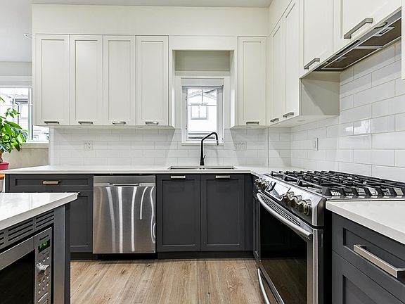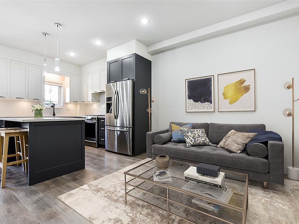 This stylish, modern townhome in New West's urban Queensborough neighborhood is sure to impress! Offering an open floor plan on the main w/ 9' ceilings. Kitchen boasting large island, quartz counters, gas range + stainless steel appliances, balcony just off the kitchen where you can fire up your BBQ. Two bedrooms upstairs with a spacious bathroom. Attached garage with additional pkg in front! The complex includes a playground - the perfect spot for your pets to roam or to watch the kids play! This vibrant community is located right on the river - find yourself minutes from Queensborough landing shopping, Queensborough community center, Starlight casino, parks and all levels of school. Catch the Q to Q ferry for a quick trip to the Quay!