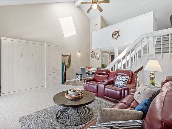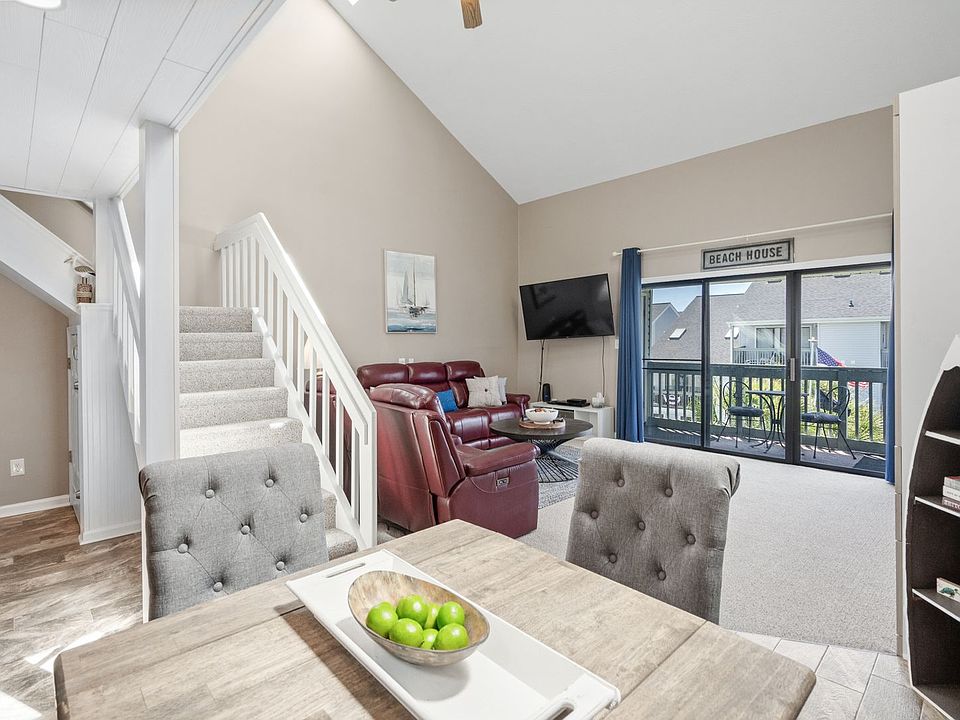 Entering the main condo door on the 2nd floor, you will have a short flight up to the main living level. As soon as you ascend, you will find a beautifully remodeled kitchen with all brand new stainless appliances, granite counter tops, bar stool seating for 2 and an additional dining table for 4 just adjacent. There is a fully remodeled bath with large stand up shower just off the kitchen and large closet for clothing storage. You will love the vaulted ceilings with tons of natural light flooding in. The living room contains additional clothing storage as well as a comfortable queen murphy bed that conveniently folds away to provide more space when not in use. There is also a fully covered porch with small dining table and seating with a birds eye view of the pool, grilling deck, and garden courtyard just below. Heading up to the loft, you will find another comfortable queen bed with a 40+" roku tv and all tv's have premium cable in addition to streaming options in case you want to watch local channels. The pool deck below has plenty of lounge chairs plus dining tables with umbrellas and the grilling deck with charcoal grills and smokers can't be beat!