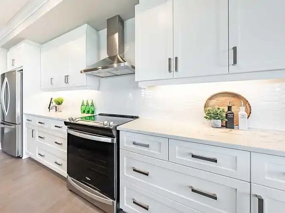 The Gourmet Kitchen Has A 10' Island, Upgraded S/S Appliances, Built-In Microwave, Pot Drawers, Soft Close Hardware, Pull-Out Garbage Bins, Pot Lights, Stunning Quartz Countertop & Backsplash! You Will Love The Large Windows & Amazing Views From Every Room, Plus A Wrap-Around Corner Balcony Overlooking Greenspace For Plenty Of Outdoor Enjoyment. Upgrades Include Crown Molding In Main Living Areas, White Oak Hardwood Floors Throughout, Upgraded Tiles In Each Bathroom, Glass Shelving In The Shower, And Much More