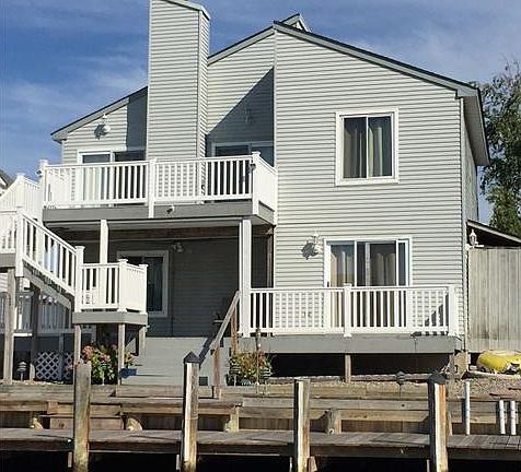 UNOBSTRUCTED view of the OPEN BAY plus protection of the LAGOON at East Point. This reversed floor plan features a huge great room with water views from every angle. 3 bedrooms with den (possible 4th bedroom) and 2 full baths. Newer decks with vinyl railings and a newer spacious two-tiered dock. Short 5 minute ride by boat to the open bay. Included gas heat, central air and a gas log fireplace. New Stainless kitchen appliances, and new flooring throughout most of home. Wired for wall mount TVS, central vacuum, outside showers, along with stones and fenced yard with large storage shed for water toys. MOVE IN READY! Flood insurance annual premium under $900. Seller is willing to hold a mortgage so this home offers attractive financing terms as well.