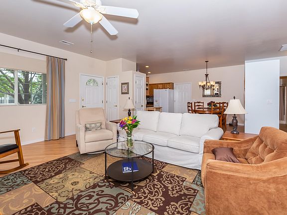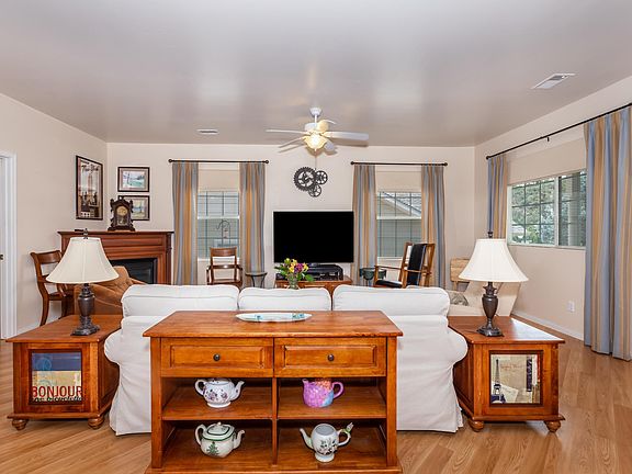 Beautifully maintained, this Victorian Estates 55+ Community Home, shows pride of ownership in every detail. Enter into a spacious living area with flooring laid at a diagonal which provides a open comfortable feel. The flow of the home from living, to dining, to kitchen, is well laid out and has a surprising about of storage. What a kitchen! Popular quartz counters, recycled glass back splash, pull out drawers, lazy susan, pantry, all make this a superb place to spend time cooking. This home also has a den with door to back yard, and special lighting for a feature wall, along with two sunny windows. The master is HUGE with an en suite bathroom with walk in shower. The two car garage comes with shelving and has a newer garage door. A new roof was installed in February of 2019 and there