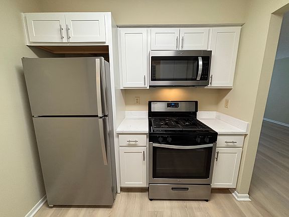 The kitchen features sleek stainless steel appliances, stone countertops, and stylish white cabinetry. The refreshed bathroom offers a clean, modern feel.
