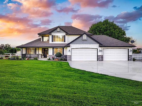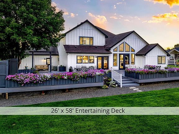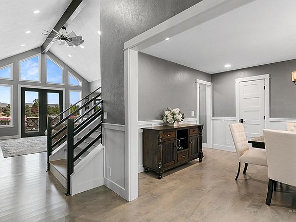 Nestled on over 2 acres, this completely renovated residence is a showpiece of modern design at the end of a long cul-de-sac and only 5 minutes from downtown Eagle. The open-concept main level features a welcoming flow where vaulted ceilings and oversized windows frame forever mountain views. A contemporary fireplace takes center stage in the Great Room, adding a touch of sophisticated allure and the kitchen showcases a Thermador appliance package, sleek cabinetry, quartz countertops, and intelligent design. The dedicated wine cellar, fenced back pasture for large animals, and fenced corral with stall are a few of the many special amenities of this amazing property. Perfect for hosting large gatherings, the spacious formal dining area and expansive Trex deck provide ideal entertaining spaces. The main level Owner's Suite offers a sanctuary of comfort with designer fixtures, walk in closet, and standalone tub. True 6 Beds, 3.5 Baths, Home Office, Dining Room, 2 Living Rooms, and 4 car garage.
