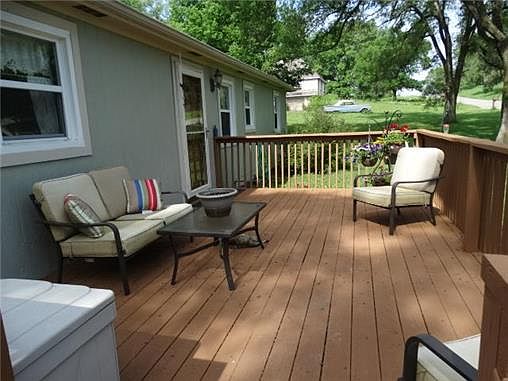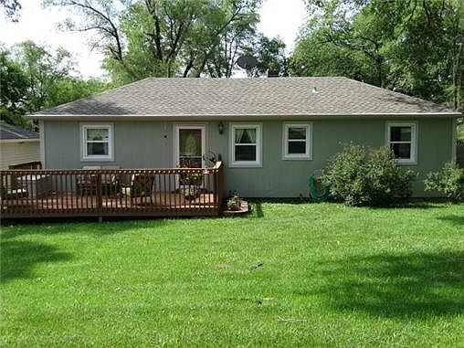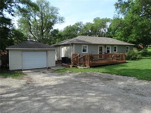 This would make a perfect starter or retirement home, everything is on one level, no stairs! This home has 3 bedrooms and 1.5 baths, the kitchen has wood floors, new cabinets, sink, counter tops and tile backsplash, all bedrooms are good sized, large 12x20 deck on the front of the home and an additional deck on the side, 1 car detached garage, large back yard with shade trees and a storage shed, easy access to I-35 and in the Kearney School District