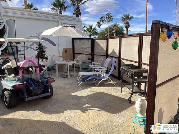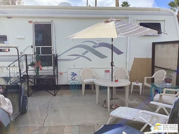 Take a look at this lovely 35 ft Fifth Wheel with 3 slides located in Wagner Mobile Home park, a gated 55+community in Desert Edge California. Close to all the golf courses in the Coachella Valley, Wagner Mobile Home Park is quiet and safe, with hot and cold mineral spas and pools. Your clubhouse is spacious with a library, kitchen, and meeting room. Play darts or shoot pool in the game room. This is perfect for the buyer looking for a new full-time residence, or a weekend getaway to visit and enjoy the Palm Springs lifestyle. Turnkey with all kitchen appliances and cutlery, bedding, tv, queen bed, all patio furniture, washer/dryer, flush toilet, extra fridge, freezer, and many tools in 10' by 8' shed. Furnace is 3 years old. Mountain and desert views. As special bonus a well maintained golf cart is included! Hurry this won't last long!