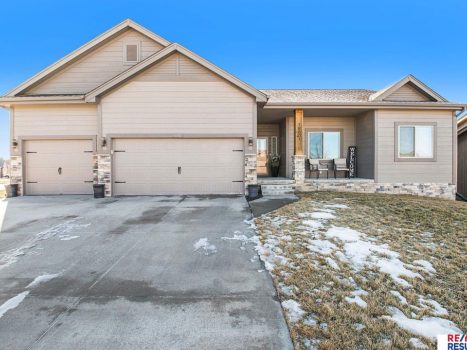 *Showings start 3/16* This is the Pre-inspected, walkout ranch in Gretna you've been waiting for! You'll fall in love w/ the large open main floor from the living room boasting a stacked stone, gas fireplace & abundant natural light leading to the spacious kitchen w/ granite counters, SS appliances, gas range, walk in pantry & dining space featuring custom trim work. The sizable primary bedroom includes trayed ceiling, en-suite bath w/ dual sinks, granite counters & laundry access. Finished lower level provides space to relax or have everyone over for the big game & also includes the 4th bedroom, 3/4 bath & lots of storage. The corner lot, fully fenced yard w/ basketball court, 3 car garage & easy access to schools, shopping & dining add to this great value!