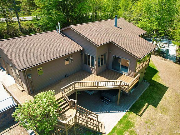 Tucked on a wooded lot is this immaculate waterfront home. Indulge in water living with this custom-built home on the Houghton Canal Road. Set on 309 feet of shoreline, this stunning home is just minutes to town. With its first floor staggered at half level intervals, this house is both architecturally fascinating and effectively planned. Entertain on the main level with fabulous views from the abundant oversized windows in the dining room, sunken living room and onto the deck which makes the outdoors a natural part of all social spaces. The highlight of the living room is the granite fireplace. The corridor kitchen also has lake views, extends into a traffic free space and is open to living areas. With solid wood custom cabinets, stainless appliances, hardwood floors, new solid surface counters, tile backsplash and undermount sink the kitchen has ample room to entertain. The master suite is on a private level, connects to the den/sitting, has its own balcony deck and a luxurious compartmented bath with double sinks, and fantastic walk-in tiled shower. On the half level down are 2 bedrooms with water views, a full tiled bath and laundry. The lowest level of the home is a recreation basement with huge family room, full bath and a huge sauna. This walkout basement will be a favorite gathering space. Just outside on the lower brick patio is a hot tub to enjoy. You’ll find hardwood floors in all of the right places, carpet in other places to keep that cozy feeling and exquisite tile in water areas. The paver tree lined driveway ends at the 2-car insulated attached garage. Stone planters line the walk to the front door. Now let’s talk out fun…with terraced outdoor living for privacy, sunning and all water sports you can enjoy the outdoors just as much as the indoors. The tiered block patio with stone steps and fire pit will extend your outside entertaining. This lot is ready to enjoy at night with extensive lighting. The permanent dock gives you a great view of the *