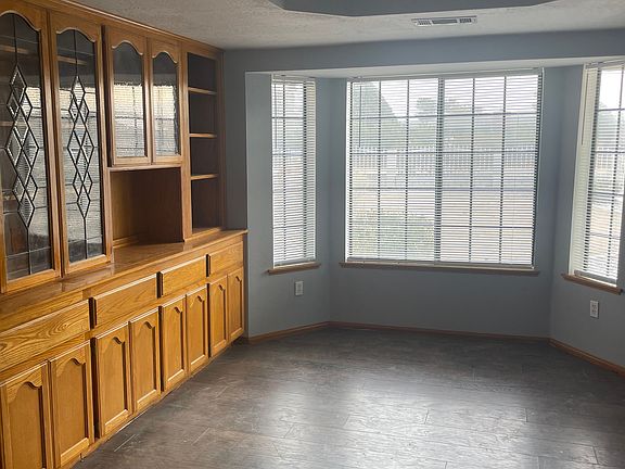 Nice floorplan with wood look vinyl flooring, stainless steel appliances. Large lot with 3 car garage. Living room with Fireplace, step down family room, formal dining area with large built in hutch. Plenty of cupboard space here with new sink and faucet. Nice bay windows in bedrooms with wood cabinet. Central heating and air. Indoor laundry, Two extra sheds for storage. Nice view of knolls area. Wrought iron in front with gate.