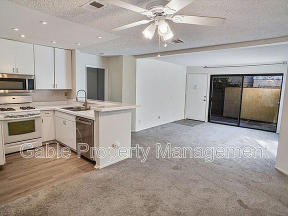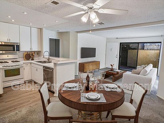 The open-concept design allows the kitchen to flow seamlessly into the spacious living and dining areas. The kitchen is equipped with clean white cabinetry, white countertops, and stainless steel appliances, while the adjacent dining area includes a ceiling fan for added comfort. The large living room opens to a private patio through a sliding glass door, creating a bright and welcoming space.