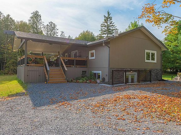 Welcome to this beautifully renovated rural residence, featuring a stunning 20x30 covered porch for outdoor dining and cooking-perfect for enjoying serene surroundings and hosting gatherings. Inside, the home showcases a gorgeous open-concept kitchen and living room. The main floor includes two bedrooms and an office, with the primary suite offering its own private bathroom and glass doors leading to a tranquil deck with hot tub. The main floor bathroom also has a washer and dryer. The basement offers two additional bedrooms, a spacious recreation room, and a four-piece bathroom. With a separate entrance, this area is perfect for multi-generational living or as a private retreat for guests. Recent updates enhance the home's modern functionality and charm, including a new furnace and roof both installed in 2020, new decks completed in 2022, along with many other updates. Stoney Lake is a few minutes away for those that enjoy water sports and fishing. Set on a 2.3 acre well-maintained rural property with a large pond for summer and winter activities makes this home an excellent choice for those seeking a peaceful country lifestyle.