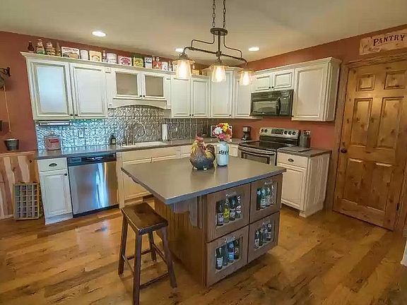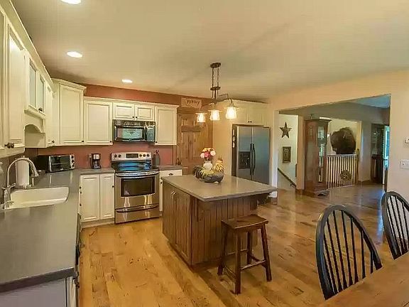 CUSTOM Barndominum. 10" insulated walls. Hardwood floors. Custom oak trim throughout home Heat/cool pump. Air circulation system with purification and humidifier. Built-in central vac on upper and lower levels with hose in wall system. Kitchen/dining combo. Walk in pantry. Ultimate safe room in basement. ADT security. Egress windows in basement. Second full kitchen in basement makes ideal age-in-place home or mother-in-law quarters. Property features two ponds, woods, walking trail on perimeter, raised garden beds, garden shed, loafing shed, and across property stream. Fruit trees planted this spring.
