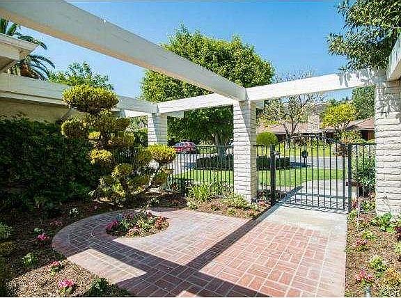 Built in 1973 on a half- acre lot, this approximately 3823 sq. ft., 4 bedroom, 3.5 bath single story home has manicured landscaping and a charming gated front courtyard with used brick paving. The dramatic entry welcomes you into the spacious Formal Living Room with marble fireplace and vaulted ceiling. An oversized Family Room also complemented by a fireplace can accommodate a home theater plus a game table. A bright, retro kitchen with custom tile counters offers an enormous walk-in pantry, breakfast bar, nook and French sliders to an open air patio, a perfect entertaining area. Updated and remodeled, the Master Suite boasts a beautiful bathroom, walk-in closet and mullioned French doors which open to another outdoor patio. Three secondary bedrooms feature bay windows, one with an en-suite bathroom. A rose garden adorns the backyard along with a cobblestone path defining the trim lawn, adding to the peaceful feel of the home and neighborhood. In addition, the corner location and slight elevation from street level allow for increased privacy. Three car garage (one used a separate workroom) and shed. Plenty of room to create RV access. No ups or downs!