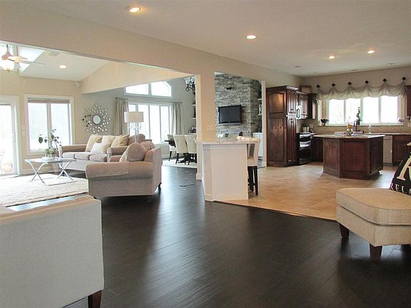 What an impressive entrance into this open concept ranch on a daylight lower level. A wall was removed and a living room added to create a contemporary functional floor plan for today's modern living. The kitchen boats an attractive granite island, a second bar to accommodate more seating, a copper farmhouse style sink, a custom cabinet including a wine chiller which remains, large ceramic tile flooring, and all appliances including the undermount TV/radio/DVD player. All baths have been upgraded with either granite or marble surfaces, new faucets and lighting. Step out onto the new deck through the recently installed patio door in the master bedroom. Additional access to the patio through the living room. New flooring throughout includes ceramic tile, carpet, bamboo, or acacia wood. All bedrooms boast walk-in closets. The unfinished LL is perfect for a weight room, hobbies. Easily finish the space as the plumbing and a few fixtures are in place for an additional full bath. Enjoy the outdoors with an additional 3-car detached garage offering a concrete floor, windows, and a loft. Goalrilla remains. The pond is stocked with a variety of fish, and a new dock and fountain complement lazy days. Geothermal heating/cooling create low utility bills and reduce property taxes. Five acres minutes from Dupont Road and yet a quiet calm oasis.