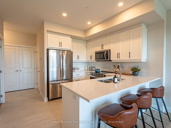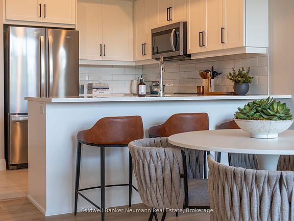 Welcome to Tricar's newest luxury condominium in Guelph's desirable south end. This beautifully designed 1-bedroom, 1-bath suite offers 800 sq. ft. of modern, open-concept living with an impressive 275 sq. ft. of combined outdoor space across a private balcony and a large terrace. The bright and spacious layout features a well-appointed kitchen with quartz countertops, stainless-steel appliances, and a comfortable dining area that flows into the inviting living room. The generous primary bedroom includes a walk-in closet, while the full 4-piece bathroom and in-suite laundry room provide everyday convenience. With premium building amenities including a fitness centre, golf simulator, residents' lounge, and secure underground parking, this suite delivers the elevated lifestyle Tricar is known for. Ideally located close to shopping, restaurants, parks, and major commuter routes, this south-end condo offers the perfect blend of comfort, style, and convenience. Move-in ready and waiting for you.