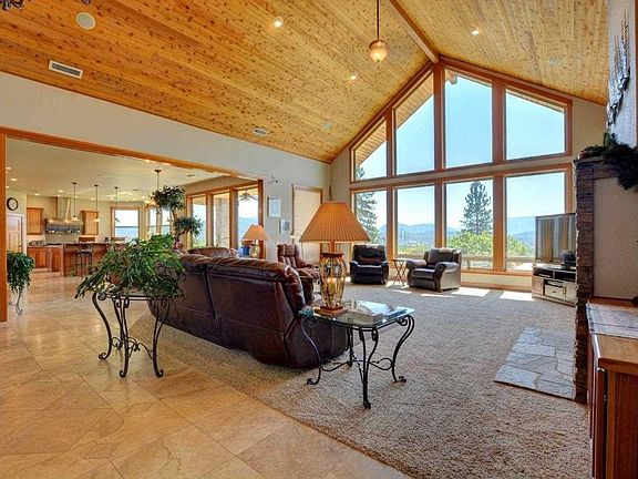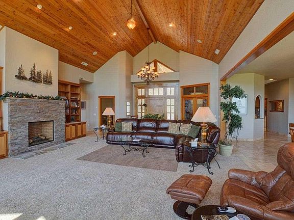 Top of the town views describes this one level ranch style home situated on One acre, minutes to down town shopping. Split floor plan adds extra privacy when entertaining guests. Owner has paid extreme attention to detail with this well appointed home. Gourmet kitchen, double islands, radiant heated floors to include front portion of garage. Owner says shop stays about 60 degrees in the winter, separate gas heating unit also in shop. Drive your 40 Ft. RV right into the covered 2200. sq. ft. shop that is attached to garage and house. Beautiful Cherry wood finishes as well as Travertine radiant heated tile throughout. Relax while watching the sunsets from this gorgeous home!