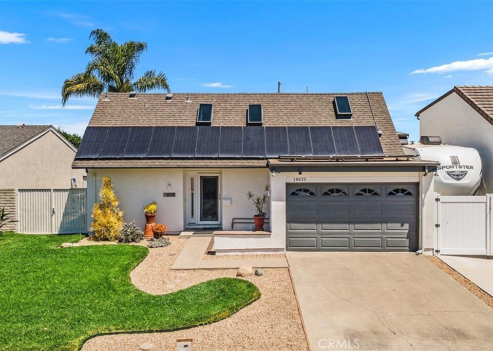 Look no further! Welcome to this beautifully appointed 5 bedroom residence that spans 2334 square feet nestled in the interior of sought-after Century Park neighborhood in South Fountain Valley just steps to Cordata Park with thoughtfully updated modern comforts & eco-friendly upgrades...including paid solar panels, tankless water heater, dual pane windows throughout, central air conditioning, newer electrical panel, water softener & water filtration system. This home boasts a bright and inviting atmosphere! Spacious ground floor primary bedroom suite with slider to side patio, two closets & lovely primary bathroom with tiled shower featuring decorative tile accents, custom wood vanity stone countertop, built-in display niche, Retreat to the bonus room upstairs or a second primary bedroom with huge mirrored walk-in closet, & skylight or an entertainment area for the kids plus 3 additional bedrooms & an attractive remodeled full bath & remodeled separate half bath. Dramatic soaring ceiling entry with dual skylights & Pergo wood flooring throughout plus tile floors in the bathrooms, newer hardware, ceiling fans, smooth ceilings, silhouette shades, newer interior & exterior paint, expansive gourmet kitchen offers custom white cabinetry, ceramic tile floor, recessed lights & abundance of counter space. Step outside to your private backyard with sparkling pool & spa for ultimate relaxation plus enormous patio for barbeques & special occasions & dedicated side yard enclosure with RV potential & RV gate. Sun drenched living room with slider to patio alcove, ideal for enjoying morning coffee or an afternoon cocktail, flows seamlessly into expansive formal dining area. The highly desired family room has abundant windows & open beam ceiling with gas fireplace. 2 car finished garage with direct access to home in addition to 2 car driveway. Steps to neighborhood park with a wonderful playground, a short drive to pristine beaches plus freeway, shopping & dining close by! Located in a top rated school district: Courreges Elementary School, Fulton Middle School & Fountain Valley High School! Southern California living at it's best with daily ocean breezes & climate that's the envy of the world makes it a prime location near the border of Huntington Beach! Close to destination attractions like Disneyland, Knotts Berry Farm, Palm Springs, Catalina, San Diego & Santa Barbara for weekend getaways!