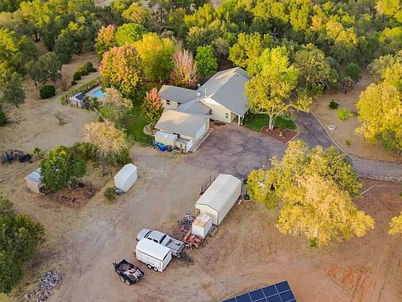 Enter through the gated entry and drive down manicured driveway to this gorgeous 3 bedroom home. 2148 sq ft with wood stove, central heat and air, fresh paint, vaulted ceilings, finished breezeway that would be a prefect mud room. Vaulted, wood lined ceiling makes for a dramatic extra living room that has wonderful views of the pool, backyard and hot tub. Kitchen has tile counters with large pantry, and open concept living into dining area and kitchen. 4.91 acres of fully fenced property, and the amenities are endless; dog kennel, animal pen, green house, chicken coop, detached garage, paved driveway, leased solar, wood stove, large master suite with exit directly into backyard hot tub. Patios, covered porches, pool with concrete pad surrounding. Wildlife and privacy make this the picture perfect property.