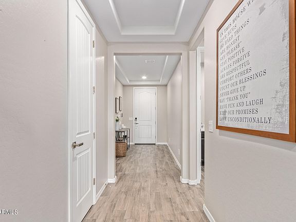 Welcome to your stunning new home in Litchfield Park! This beautiful 4 bedrooms, 3 bathrooms, split floor-plan home is situated on a private lot with no neighbors behind, offering peace and privacy. The 3-car tandem garage provides ample space for your vehicles and storage needs. The home is located in an area with A-rated schools and is only 15 minutes from Luke Airforce Base. Built in 2020, this home is almost new and features many modern amenities. The wood plank ceramic tile adds a touch of elegance to the living areas, and the gourmet kitchen is perfect for the home chef. The kitchen boasts a gas range, wall oven and microwave, gorgeous slab granite countertops, and a huge kitchen island with plenty of seating. The 42-inch cabinets offer ample storage space for all of your kitchen essentials. The resort-style backyard is perfect for entertaining, featuring travertine pavers, a gas heated pool with a Baja deck, a Ramada with a gas fire pit, and no maintenance turf. The master bedroom is a true retreat with an oversized shower and a spacious walk-in closet. Don't miss out on the opportunity to make this beautiful home your own!
