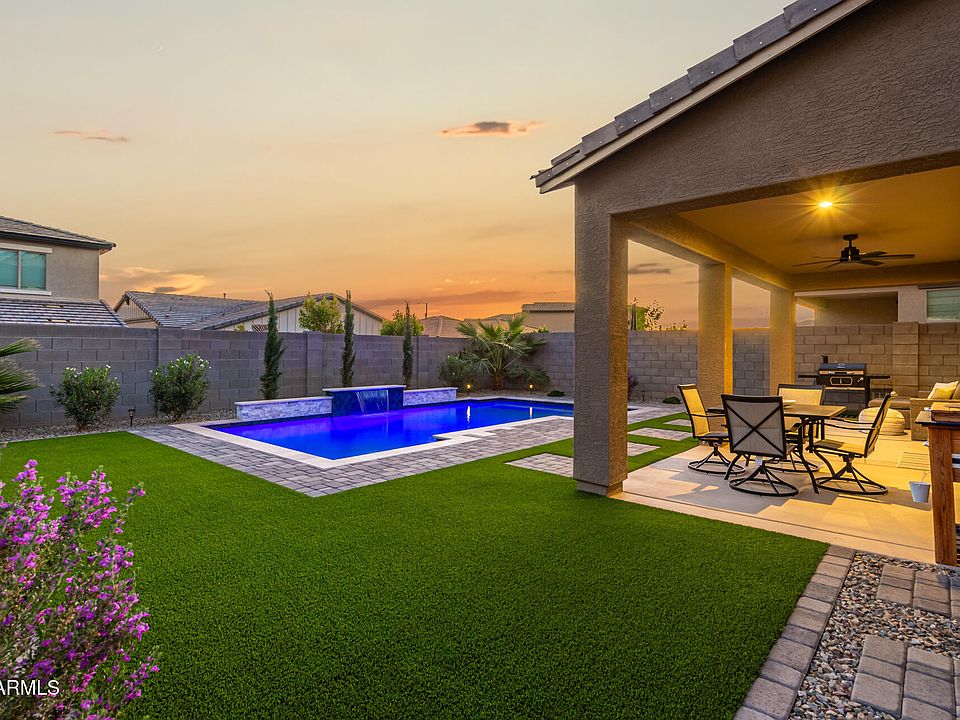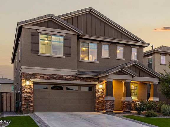 THIS LIKE-NEW 2022 BUILT HOME SHOWS LIKE A MODEL HOME! Contemporary features & upgrades rarely found: NEW Pebbletech pool, Lush green front & backyard landscaping & paver patio, porch, sidewalk, steps & pad($90,000), Sleek front door w/glass, Modern ceiling fans & lighting, 3-tone paint & tall baseboard, Modish feature walls includes vertical fireplace with heat. Builder upgrades include Farmhouse/stone elevation, Gourmet kitchen w/high-end wall ovens & separate gas cooktop/canopy hood + 42'' shaker cabinets with crown molding + Kashmire granite + subway backsplash + satin nickel finishes, Wood-look tile & upgraded carpet, Double slider & oversized patio, Deco stair rail, 10 ft ceilings + 8 ft doors t/o, Soaking tub & shower tile with herringbone inlay. MORE...some warranties still exist Highly desirable floorplan: 5 Bedrooms and 3 Full Baths including a Bedroom and Bath downstairs, PLUS Loft. Huge Greatroom wide open to Kitchen and 2 Dining spaces. All non-primary Bedrooms larger than average! Storage is above expectations with an oversized Walk-In Pantry and under the stairs Walk-in Closet, and extra hall cabinets, as well as Walk-in Closets in Master and spare Bedroom.