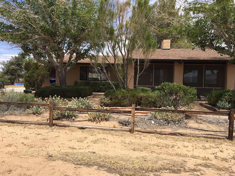 Beautiful horse property! This home is a must see...very Spacious inside with beam wood high ceilings, rustic feeling, brick fp in the liv. rm., lots of windows thru-out, front enclosed patio, extra rm. attached to large.gar., also has a large shed. All fenced sitting on almost 5ac, horse trails to the Mojave river, mature trees all around. Peaceful area with beautiful sunset views of the mtns. Frontage is only about 500ft away from pavement. Will look at all reasonable offers.