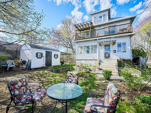 Do you dream of country living but want city convenience? Rare Boston single family home with private waterfront access gives you both. Walk down to the water, put your kayak in and paddle away on the historic Motherbook! Set way back from the road on a peaceful, wooded lot, this unique American Four-Square colonial offers four finished levels. Enjoy the light in your marble-tiled sunroom. First floor offers a living room, a dining room with water views, kitchen and full bath. On the second floor, a sunny hall tiled with Vermont slate has sliders opening to your large deck. The front bedroom also has sliders to the deck, where you can relax under the pergola. Two large bedrooms have views of the water. Full bath has a marble floor and a glass block shower. Finished third floor offers two more bedrooms, one with access to a second deck. Finished basement with two bonus rooms. Unwind on the patio. Gardener's paradise, with barn & shed. Zoned 2F-5000.
