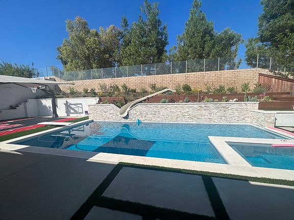 The homeowners have lovingly updated the backyard a year ago into a true private retreat. Enjoy a sparkling pool with an integrated water slide, diving board, and large jacuzzi, plus a half basketball court and beautiful landscaping with varieties of plants.