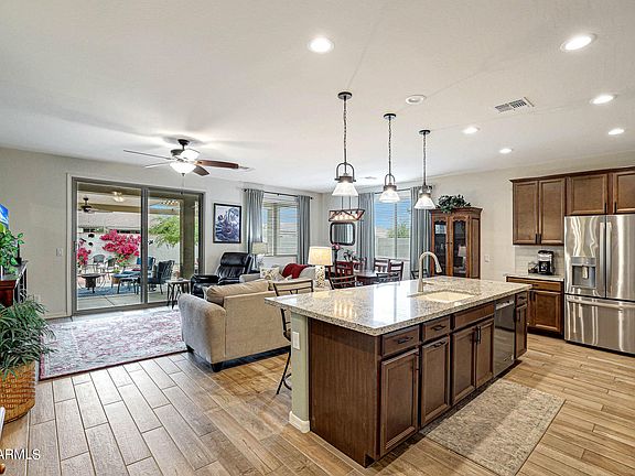Discover the rare gem you've been searching for in Litchfield Park! This captivating home offers a seamless blend of comfort and elegance, featuring 2 bedrooms, 2 bathrooms, and a versatile den/flex room that can easily be transformed into a 3rd bedroom. Step inside to a welcoming great room concept that exudes a light and bright ambiance, perfect for gatherings or quiet evenings at home. Plush carpet in just the right places adds a touch of warmth, while wood plank tile throughout the main living areas combines durability with modern aesthetics. The heart of the home, the kitchen, is a chef's delight, boasting beautiful granite, roll-out shelving in the cabinets for convenient storage, and all appliances included. Entertaining is a joy in this home, with great spaces both indoors and out The extended patios and pergola offer a serene setting for outdoor gatherings, complemented by breathtaking mountain views. Located in a desirable area of Litchfield Park, this home combines the tranquility of a great location with the convenience of nearby amenities. And why wait for a new build when this almost-new home comes with all the upgrades already included? Don't miss out on this beautiful home that's been meticulously cared for and is waiting to be yours.