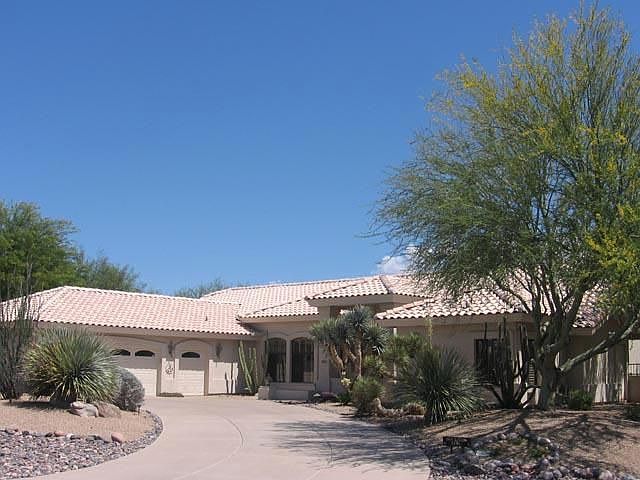 This lovely home on the golf course is priced to sell! Golf course front and back with beautiful mountain views. Walk through the front door to open living/dining room with a wall of windows out to patio and 'Spool', built in BBQ and those views! Kitchen was totally changed out from original and opens to family room and more views. Casual eating plus breakfast bar, Granite, stainless and cherrywood cabs. The den/office has built in desk and Murphy bed for overflow of guests. Master is split with His & Her closets & updated private bath. Epoxied drive to 2.5 car gar with storage. Large tile, wood floor (2009)and carpet. Rio Verde is 80% 55+ adult community with two 18 hole golf courses. Great membership drive going on through 2012!