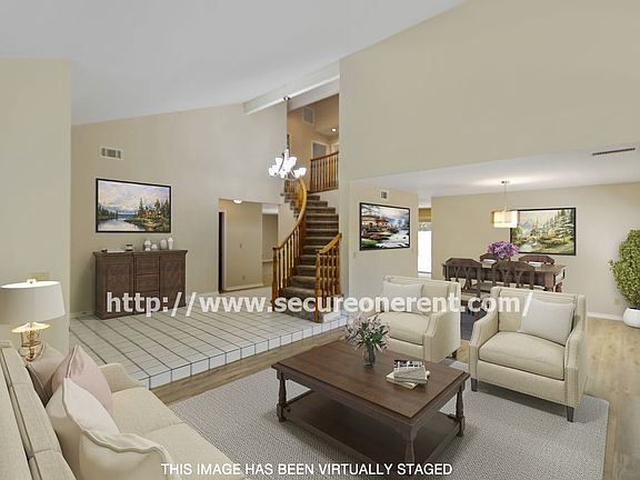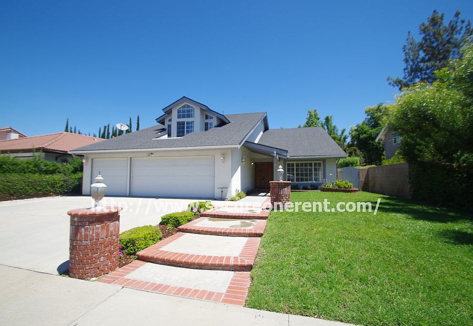 This beautiful two story Porter Ranch home is settled on a lovely street in a desirable and well-maintained neighborhood. The home offers just under 4000 square feet of spacious living space, with soaring high ceilings and numerous large windows throughout. It features brand new wood-like flooring, 4 bedrooms + bonus office room, 3 and bathrooms, freshly painted walls, new fixtures, incredible storage closets and cabinetry throughout, and much more! Upon entering, there is tile flooring and a view of the beautiful custom staircase with brand new carpeting. There is also a formal living room and dining area. The kitchen features a gorgeous stainless Viking range, Sub-Zero stainless fridge, stainless dishwasher, tile countertops, and loads of cabinetry space. The family room is adjacent to the kitchen, offering a cozy fireplace and a patio door opening to the backyard. The lovely backyard has a lush grass lawn and landscaping, a concrete patio area, and a side-yard. Downstairs there is an office with brand new carpeting, powder room, and huge laundry room/ storage area. The 4 bedrooms are upstairs. The master suite offers an impressive walk-in closet and an attached private bathroom with two sinks & shower stall. There are two other bathrooms upstairs for the other 3 bedrooms to share. There is also an additional walk-in storage closet at the end of the hall upstairs. The home has an attached 3 car-garage, with newly epoxied floors, that provides direct access to the house. It has central heat and air. Weekly gardening service is provided. This home's prime location places it within minutes from fabulous Porter Ranch shopping, hiking trails, parks, and freeway access. This is a non-smoking property. Please submit for pets. Additional pet fee is required. Several photos have been virtually staged. This home is not furnished.