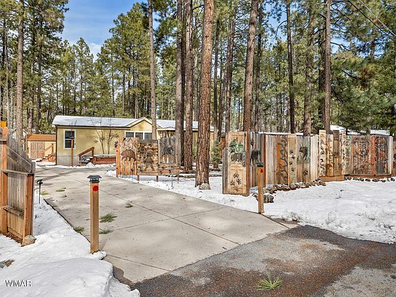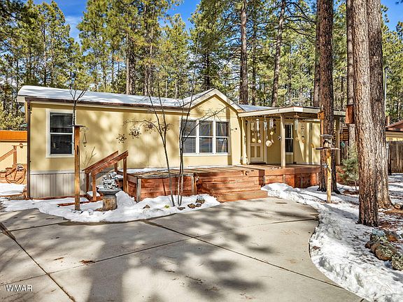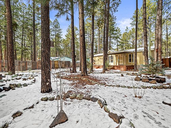 Cozy mountain retreat located on a beautiful wooded lot. This 3 bedroom, 2 bath manufactured home built in 2008 has been meticulously maintained and is move in ready. The owner recently installed a large picture window in the back bedroom making it light ands bright. The primary bedroom is split from the secondary rooms with en suite bathroom and double sinks. The exterior includes a covered front deck and storage shed. This neighborhood has quick access to Pinetop's shopping, fishing, skiing and everything in between that the White Mountains have to offer. Furnishings are available for purchase.