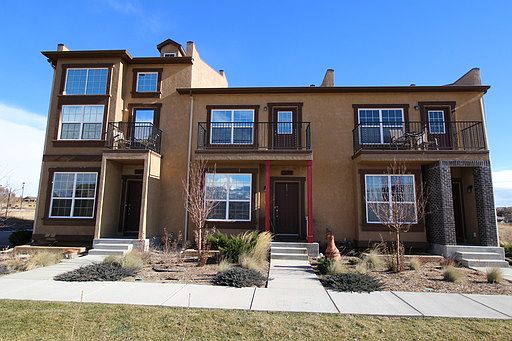 Incredible Views! This townhome is situated on a beautiful raised lot with expansive views from the deck off the master bedroom. The main floor has a powder room, kitchen with stainless steel appliances, and a living area with area to mount your flat screen tv! Upstairs you have 3 bedrooms and 2 full bathrooms. The master bathroom is a full bath with a huge closet! There are two separate closets in the master! Laundry room is also upstairs. Attached two car garage! Main level has pergo style flooring. The unfinished basement offers extra room for storage, play area, hobby area, or anything else you can dream up! Although walls appear to be shared with units on either side there is actually a gap and the walls are not shared. This makes for much quieter living without having to hear the neighbors! House has A/C and heat. View from the balcony include; Norad, Broadmoor, Garden of the Gods, The Incline, World Arena, and you can see all of downtown. Since the subdivision is expanding, this particular was given the prime location. No houses/townhomes will be built in front of the views. Instead, a park will be build right outside of your doorway once the subdivision becomes larger.