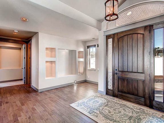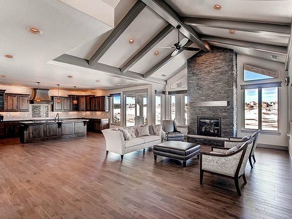 With incredible attention to detail, this exquisite home is one of the most spectacular examples of luxury and livability, and truly embodies what the prestigious Kings Deer community has to offer. Located on over 2.5 acres, backing to the Kings Deer Golf Course, just minutes away from parks, trails, community club house restaurant, and D-38 Schools! With easy access to Hwy 83 & I-25 making for an easy commute to both Denver and Colorado Springs, this beautiful home offers the ultimate in convenience. Complimenting this perfectly situated home is an open and inviting floor plan, where comfort meets functionality. True main level living offers no stairs, a master retreat, formal dining room, Jr. Suite and a 3rd bedroom, providing ideal usability to fit all your needs. Walk inside and the gracious entry greets you with gleaming hardwood floors that extend throughout most of the main level matched with vaulted ceilings creating open spaces between each room. The dramatic entry leads to the formal dining room accented with ambient lighting, tray ceiling and large window framing mature pine trees, creating the ideal space for formal entertaining. Step into the great room, which boasts a floor to ceiling stone surround gas log fireplace, and is highlighted by dramatic picture windows, rising to soaring beamed ceilings which deliver an abundance of natural light. Continue on to the gourmet kitchen, which features stainless steel Jenn-Air appliances with a smooth cooktop which is also plumbed for a future gas range, a stand alone slab granite island adorned with Hubbardton Forge Pendant Lighting, 42 inch alder cabinets with crown molding, upper and lower cabinet lighting, Carmargo limestone backsplash and slab granite counters meeting your culinary needs. This magnificent kitchen also boasts a large breakfast nook that walks out to the covered patio, where you can entertain friends and family while watching a round of golf or the sunset over Pikes Peak and the front range. At the end of the day, escape to the sophisticated master retreat featuring French doors, vaulted ceilings, in-ceiling speakers, room for seating, a double sided gas log fireplace with stone surround, oversized walk-in closet with separate closet for the home audio equipment and a truly luxurious 5pc master bath; with Hubbardton Forge sconces, ceramic tile floors, his and hers vanities, large soaking tub and oversized zero entry shower with euro glass enclosure. Steps away from the master retreat is a 3/4 bath, a 3rd bedroom with large walk in closet, in-ceiling speakers, and overlooks the golf course, creating a secluded workspace while never having to feel too far from it all. Completing this stunning home is the private Jr. Suite with picturesque views of Pikes Peak and the golf course, full bathroom and large walk-in closet. Completing this sprawling home is a spacious, lined crawlspace offering ample storage space . Elegance and excellence meet in the Kings Deer Community which offers an active lifestyle with its year round - 18 hole golf course, a beautiful clubhouse and restaurant, golf shop, putting and chipping area, large elevated practice range, walking paths, soccer fields and 200 acres of native rolling hills, lush wetlands and natural beauty.
