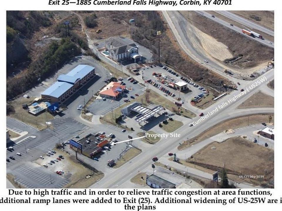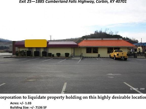 Corporation to liquidate Real Estate property holding on this highly desirable location at Exit 25 Corbin, KY. Building size: +/-7100SF. Current usage: Restaurant. High traffic location directly off Exit 25 of I-75. Close to Civic Arena, Hospital,Theater and more. Call to show, seller will coordinate showing times with their tenant. Call for more details.