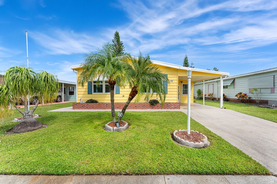 In the 55+ community of Palm Bay Colony, this home blends thoughtful updates with inviting charm. A 2018 metal roof, newer Pella windows, and 2024 AC provide peace of mind, while the kitchen—remodeled in 2016 with all-wood cabinetry, granite counters, and stainless appliances—anchors the living space. Both baths have been refreshed, ...