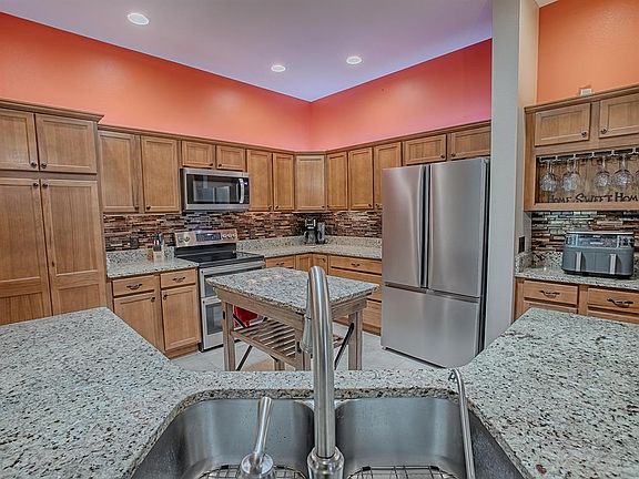 Decorative drive and walkwayGranite countertopsGranite top vanityExtended garageOversized enclosed lanaiCustom tiled wallRich wood cabinets