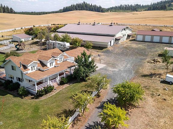 Your horse is saying ''Buy me this home!'' Stunning 10-acre Equestrian Estate spanning WA & ID on the Cd'A Reservation with sweeping views of Worley, ID and Rockford, WA. Outlined with classic white vinyl ranch fencing, this property features a spacious 3-bed, 3-bath home with master ensuite, loft, and unfinished basement. Classic Cd'A Casino carpet adorns the home, adding flair and nostalgia. Enjoy sunsets from the covered front porch and starry skies from the back deck, overlooking rolling hills, a custom fire pit, and expansive backyard. Equestrian amenities include a 120'x80' barn exceptional height with tack room, office, workout room, 5 stalls, full-size arena . Outbuildings: 4-bay shop (1 finished bay), 4-stall stable, multiple sheds, RV parking, chicken coop, fenced garden, & premium water filtration system in a dedicated pump house. Unlimited possibilities for luxury, lifestyle, & legacy in this gorgeous & peaceful setting!