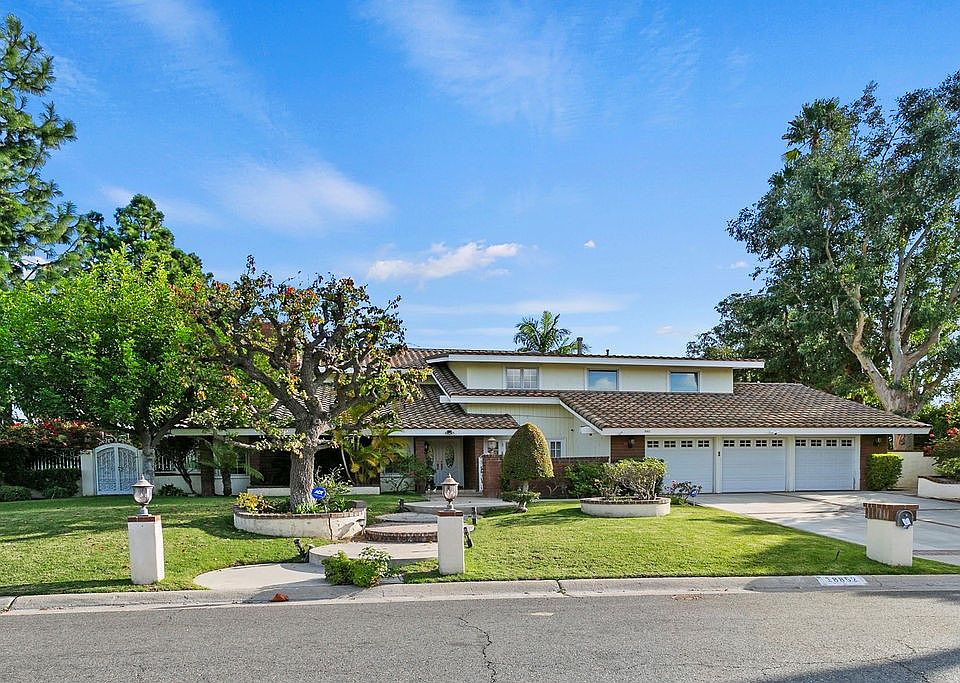 Situated on one of the most sought-after streets in Villa Park, this view-lot diamond in the rough is primed for a return to its former brilliance. Boasting 5 beds and 3 baths and a massive 4,700 square feet, this estate offers the space and flexibility desired in the latest exodus from high density living. Set on a sprawling 20,305 sf ft lot WITH views, this loving home presents an opportunity that doesn’t come around very often. This home’s potential is multi-faceted in that it can be a light reno, heavy remodel, or PRIME location for Villa Parks increasing New Construction market. Enter through elegant lead glass inlaid double front doors into a spacious two-story ceiling entry. Intricately laid travertine with patterned in-sets, and beautifully maintained custom hardwood stairs give this home a feeling of warmth and elegance. The living room is spacious with cathedral ceilings, foreboding brick and finished-carpentry fireplace, large picture windows, and double door access to huge flex room! The dining room is spacious, with plenty of room for a 12-person. The family room is open in great room style and very spacious with arched brick class-A fireplace and huge window bay overlooking the sprawling resort back yard. The flex room might be the second-best feature behind this property’s sprawling view lot location. This room is PERFECT for in-laws’ quarters, secondary master, interior guest suite, and so much more. With elegant hardwood floors, large bay window, pass through fireplace, and its own bed and bath, this room’s possibilities are endless. Features include attached bath, views of the parklike grounds, and private location. Kitchen is finely appointed with custom cabinetry w/ glass inlaid uppers, stone counters, SS appliances, spacious center island, finely finished vent hood, and pantry. Upstairs primary is very spacious with beautiful views of the rolling Orange hills, sprawling reservoir, and blues crisp skies. Primary has a great footprint. Double sinks, soaking tub, and walk in shower give this bath the bones needed for an elegant restoration. Secondary bedrooms are spacious. The crown jewel is the absolutely massive view lot backyard, complete with sports court, resort style pool, lush mature landscape, built in BBQ and outdoor dining area. This home’s possibilities are endless. Other features include canned lighting, three car spacious garage, putting green, light airy floorplan, HUGE laundry, and so much more.