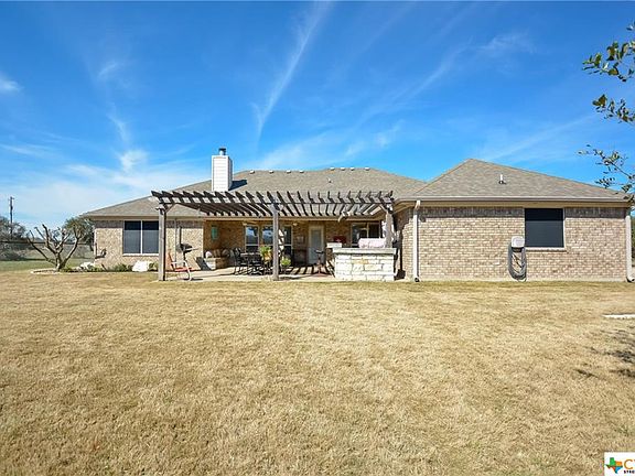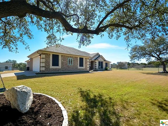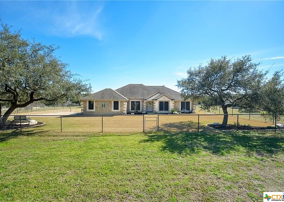 Sophisticated yet with country warmth & charm this custom built home amidst 10 tree-studded acres will lure you away from the city bustle. Imagine vivid Texas sunsets viewed from the swing under the majestic oak in the front yard, or basking in the sun on the back patio while the little ones frolic in the fence enclosed backyard. Upgrades & amenities wow for attention throughout the home, starting with the brick/native stone combination exterior & carrying it through the thoughtfully designed floorplan. Hard-tiled pavers dress the main living & wet areas, providing continuity for the open lay-out. Natural light floods the formal dining room through twin windows, ceiling medallion enhances the chandelier. A stone-clad corner fireplace is the focal point in the Great Room, ample wall space easily has the capacity for any entertainment center. Granite tops the counters in the to-die-for kitchen, loads of cabinets & a walk-in pantry hold a storehouse of groceries & utensils. The light-filled breakfast nook overlooks the backyard & tree-dotted rear acreage. Mastersuite is separate from the minor bedrooms for parental privacy, offering patio access plus a lavishly appointed bath, complete w/whirlpool tub, separate shower enclosure, twin walk-in closets, culture marble topped vanity w/dual sinks, & separate toilet compartment. Interior utility room is equipped w/utility sink & additional cabinets. The guest powder room is conveniently tucked i