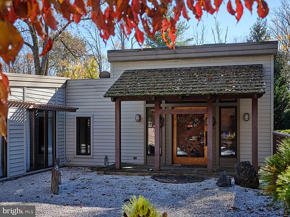 Privacy and serenity. Exquisite architecture. Modern luxury. 1886 Aquetong Rd is a property suited for the most discerning buyer. One who seeks exceptional beauty and the innate desire to reside in a one-of-a kind art piece. The home was artistically designed and built by one of the leading innovators of 20th century furniture design, internationally acclaimed artist George Katsutoshi Nakashima. The sprawling contemporary home is enveloped by Japanese inspired rock gardens, or sekitei. Strategically placed stones and expanses of white raked gravel are vital elements to a Japanese garden and are considered the ultimate expression of beauty. The entrance hall sets the tone to amaze anyone who enters. Understated elegance, yet absolute uniqueness is created by a tasteful combination of architectural choices, such as: The stunning entrance door, a masterpiece created by George Nakashima, consisting of a huge live piece of wood surrounded by edged glass. The soaring beamed ceiling with four skylights, the original warm walnut floors, the original large Japanese inspired circular windows and a babbling indoor stone koi pond. Together with the adjoining art gallery, the foyer design is the perfect blend of architectural grandeur meets minimalism. And truly captures the peaceful essence you will experience throughout the remainder of the home. Adjacent to the gallery you will find the amazing designer powder room. The ultramodern Seimatic kitchen features deep lacquer detailing, black granite countertops and high-end appliances. Centering the kitchen and surrounding dining and living areas, you will find a customary Tokonoma tree post, which honors visitors. Multiple sets of glass doors bookend the spacious great room, providing direct access to expansive decking. Dine al fresco by the light of the elevated fire bowl, overlooking meticulous gardens and meandering stone walkways. Adjacent to the kitchen/dining room separated by two custom designed double doors you will find a small meditation room, presently used as an art studio/library. Multiple skylights and large glass doors inspire the feeling of living with nature. The primary bedroom suite with its expansive elegant marble bathroom offers peace, calm and privacy. A wall of windows and doors provide unobstructed views of the surrounding tranquil landscape. Marble tub and shower, multiple custom closets, and a mirrored dressing area complete the opulent master suite. The guest wing adjacent to the gallery hall offers two large bedrooms, featuring a uniquely beautiful bathroom, a wet bar and a small sitting room with large glass doors that open to the garden. The larger bedroom of the two features a small office area and a separate private entrance to the front yard. A professional office space, also with separate entrance, and a galley style laundry room complete the remainder of the sprawling interior. A large bonus room located above the two-car garage provides ample space for an additional office or art studio. While it may be a conversation piece through its uniqueness it simultaneously offers serenity and peace. Surrounded by forest on the back of the property as well as large trees and foliage on both sides ensuring seclusion and privacy. This spectacular country retreat is ideally located just 71 miles from New York City and 39 miles from Philadelphia. As well as mere minutes from New Hope’s famed Delaware River canal path where you will undoubtedly enjoy long peaceful walks or bicycle rides along the endless riverside lane. 1886 offers a once in a lifetime opportunity to own and live in a rare and extraordinary piece of artistic history. Its understated elegance is beyond compare and is widely considered to be the ultimate collector’s piece.