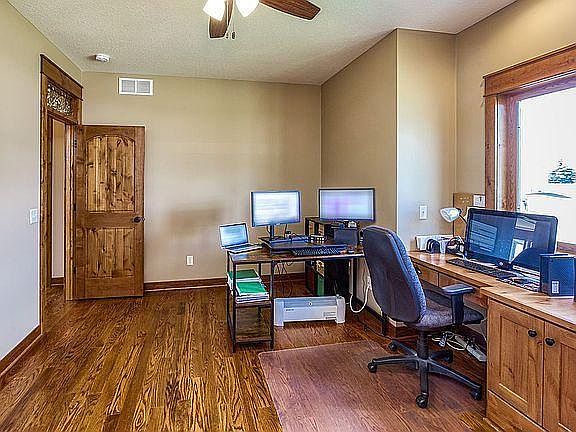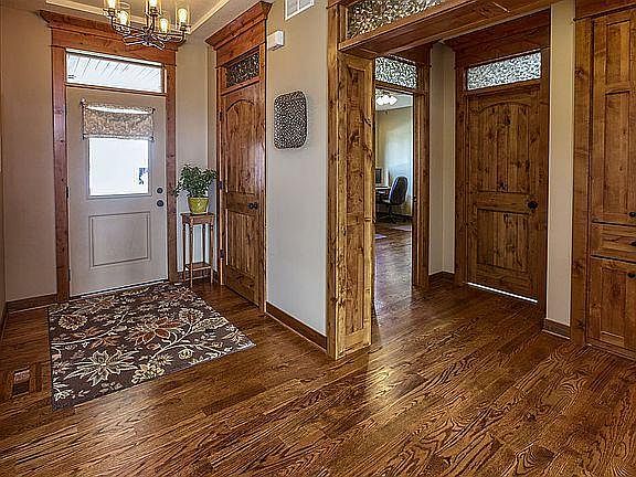 Beautiful rambler, 4 bedroom, 3 bathrooms, open concept, spacious kitchen, knotty alders cabinets, 10' kitchen island, granite countertops, stainless steel appliances, walk in panty, real oak hardwood floors, 9'ceiling, main level fireplace, dining room walks out to a maintenance free deck w/ stairs, coffered ceiling in master bedroom. Lower level has 2 additional bedrooms, wet bar, poker/game room w/tin ceiling. Large family room w/ theater projection, large storage room. Hard to find finished 4 car garage w/ heater, concrete driveway, sprinkler system, beautiful lawn. Wonderful neighborhood on a quiet street.