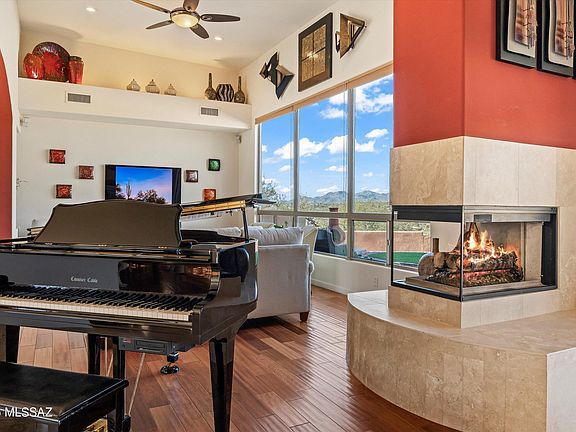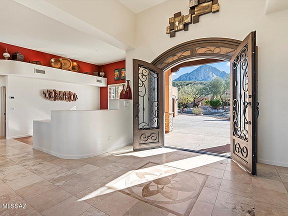 Exceptional Contemporary Santa Fe Estate in Guard-Gated La ReserveCommanding one of the most coveted ridgetop settings in Oro Valley's prestigious guard-gated La Reserve, this contemporary Santa Fe-style estate offers a rare combination of privacy, architectural distinction, and breathtaking natural beauty. Spanning approximately 3,547 square feet and set on nearly an acre, the home captures panoramic, protected views across the valley and toward the dramatic peaks of the Pusch Ridge Wilderness--an irreplaceable backdrop ensuring lasting tranquility and visual impact.A striking custom iron entry sets the tone upon arrival, opening to interiors defined by thoughtful scale and refined craftsmanship. Travertine flooring with an inlaid compass rose, soaring ceilings, art niches and walls of glass immediately draw the eye outward to the surrounding landscape. The expansive great room serves as the heart of the home, seamlessly connecting living and entertaining spaces while framing sweeping mountain vistas. A dramatic three-sided, glass-enclosed fireplace anchors the great room, adding warmth and architectural presence on cool desert evenings.