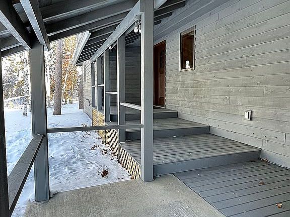 Unique covered front porch keeps steps to a minimum & keeps you & your packages dry. Coded door lock comes in handy if you forget your key, have out of town guests coming at inopportune time, etc. New entry doors feature commercial grade lever handles for ease of use when your hands are full. Cedar siding, stained last summer.