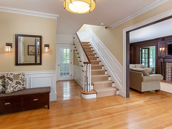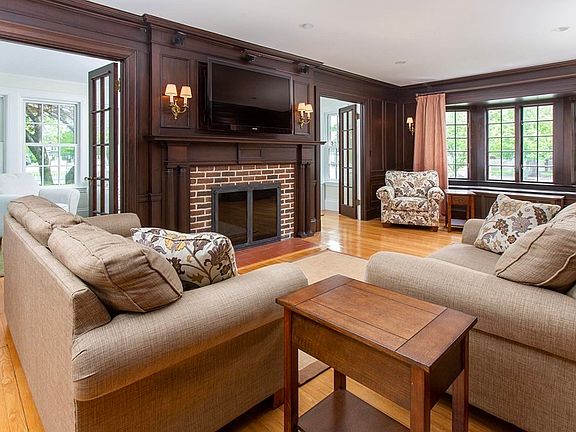 Gracious brick center entrance Colonial set on a landscaped level lot of 11,432 sq. ft..This extensively renovated 5 bedroom, 3.5 bathroom home offers over 3,600 sq. ft. of living space. The foyer is flanked by a mahogany paneled living room with fireplace and a spacious dining room with access to a side porch. The renovated kitchen with center island has custom cabinetry, double wall ovens, beverage refrigerator and induction cooktop. A den, powder room and laundry room complete this level. On the second level is the main bedroom with renovated bathroom and walk-in closet, plus 3 additional bedrooms and a full bathroom. The third floor has an additional bedroom, renovated full bathroom and attic storage. Partially finished lower level with playroom and direct access to the outside. Additional amenities include a vestibule, two-car detached garage, slate roof,high velocity central A/C and a 22' by 21' patio. Convenient to major routes of transportation, shops and the Commuter Rail