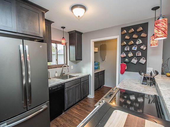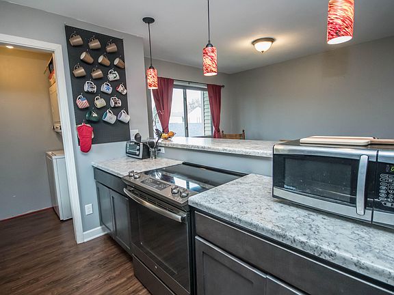 Let this beautifully remodeled upper 2 BR condo meet your needs!Open concept featuring brand new kitchen (cabinets, countertops with bar, slate-colored appliances), luxury vinyl flooring, fresh paint throughout, new lighting (high hats, ceiling fans, pendants), laundry area (incl. new W/D), new hot water heater, private entrance & balcony. 1 car detached garage with brand new opener & keypad plus 1 surface parking. Conveniently located yet tucked away in a lovely residential neighborhood within walking distance to Fox River Park & Sunset Dr shopping.